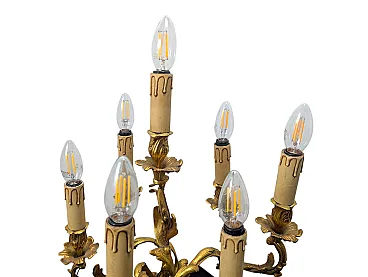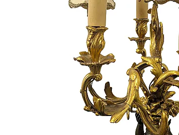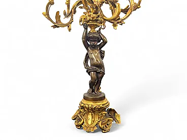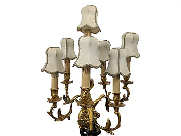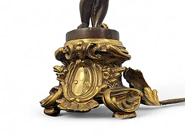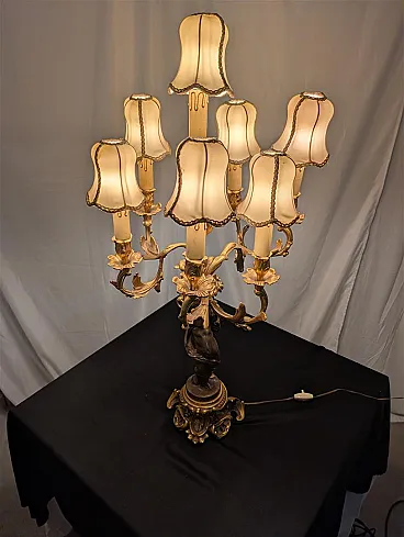 Seven-light table lamp in opulent style (probably Louis XV/Rocaille), characterized by a richly decorated base in gilded brass and a central shaft consisting of a patinated bronze sculpture (putto). Seven spiral arms support the lights with E14 socket and small lampshades.