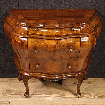 Small Venetian chest of drawers from the mid-20th century. Wavy and rounded piece of furniture, carved and inlaid in walnut, maple and beech wood with beautiful lines and pleasant furnishings. Chest of drawers with three drawers of good capacity with wooden upper shelf in a character of discreet size and service.