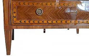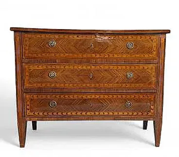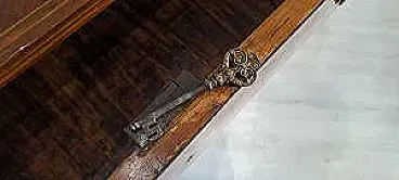 Geometric inlay (Marqueterie): The most valuable element is the rich decorative apparatus. The facade, sides and top are adorned with complex geometric herringbone (or fishbone) marqueterie in light and dark essences. This decoration is framed by a double inlaid thread which features a valuable "arrow" or "chevron" motif, a design much loved in Piedmont for its chromatic and optical liveliness.
