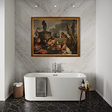 In the background other satyrs, small and large, complete the composition, accentuating the playful and chaotic tone of the scene. Ideal for a large representative environment, classic or modern, because the evocative force of the myth can easily dialogue with contemporary furnishings. 20th century frame in gilded wood, finely decorated, with some signs of aging. Work already restored with relining, replacement of the frame and restoration of color in small spots. Overall in good state of conservation. Picture lamp H 115 x W 143 cm.