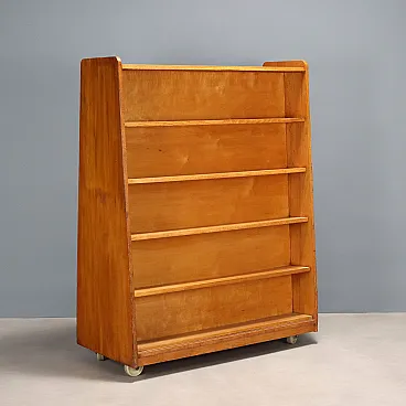 Vintage piece of furniture that can be used as a bookcase or display unit in maple veneer wood with wheels and shelves on both sides.