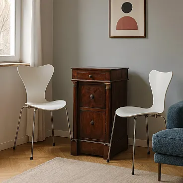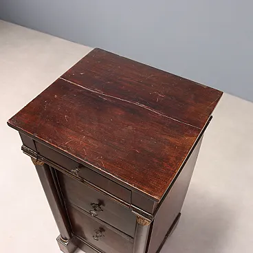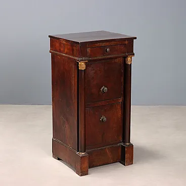 Empire walnut nightstand. Front with a drawer projecting from the under-counter band, central door and drawer below. Pair of turned columns with carved and gilded capitals and plinth feet. Italy, first quarter of the 19th century.