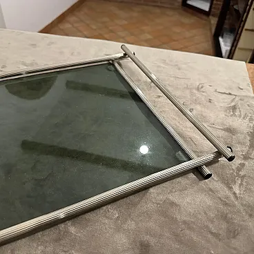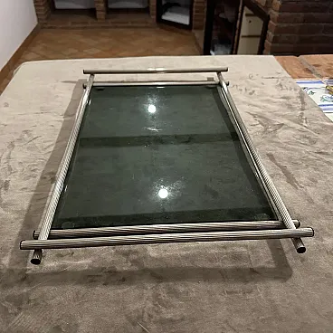 This tray embodies the sophistication of Mid-Century Modern design with a distinctly Italian aesthetic. The frame features a gleaming Silver Plated finish on tubular metal with a ribbed texture on the handles, offering a chic tactile element. The center is fitted with a cool, rectangular Grey Glass panel, which is slightly tinted, adding depth and contrast to the silver frame. The handles are cleverly integrated, extending beyond the main body of the tray on all four sides. They are capped with rubber tips, a common detail of the era, which also helps protect surfaces. The overall look is minimal, functional, and undeniably stylish. This piece is perfect for serving cocktails, appetizers, or as a sophisticated decorative item to elevate a coffee table, bar cart, or sideboard. It's a fantastic find for collectors of vintage barware and Mid-Century Italian furnishings. This vintage tray is in good, pre-owned condition,T the grey glass is intact and solid.