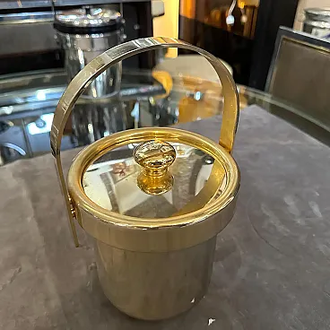 This is a 1970s Mid-Century Modern Italian ice bucket crafted from gilded metal. The bucket features a sleek cylindrical form with a polished gold-tone finish, reflecting the era's love for luxurious yet minimalist design. The removable lid is adorned with a round, sculpted handle, adding both functionality and elegance. A sturdy, curved handle arches over the top, making it easy to carry and enhancing its decorative appeal. The reflective gilded surface gives this piece a glamorous, sophisticated touch, making it a stylish addition to any bar or entertaining setup. Perfect for vintage-inspired interiors, this Italian ice bucket captures the essence of 1970s design—blending functionality with timeless elegance. It's in good condition overall with signs of use and age visible on the photos.