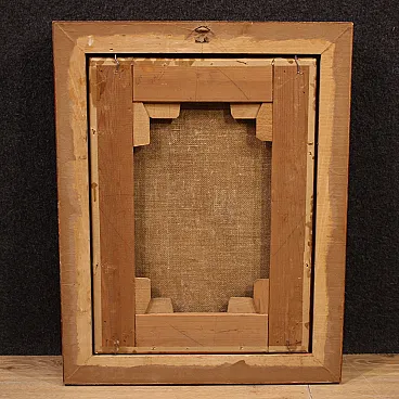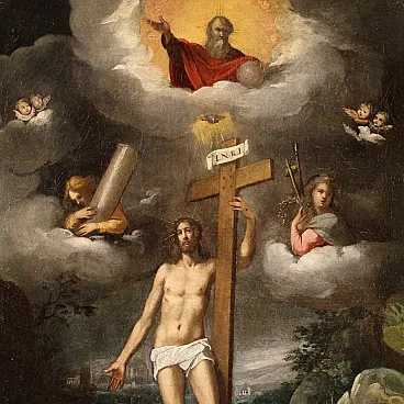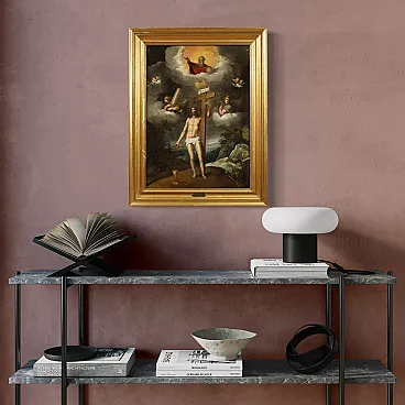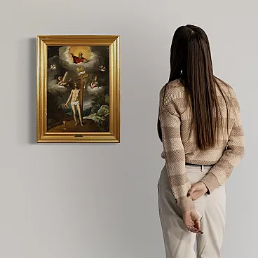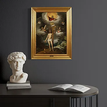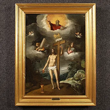Ancient Italian painting from the mid-17th century. Oil on canvas work with a religious theme, Risen Christ, of excellent pictorial quality. Small size painting, for antique dealers and collectors of ancient sacred art. Painting depicting Christ with the cross at the center of the scene and a landscape with small architecture in the background. The blood of the son of God flows from his hand to fall into a golden chalice placed on the ground. On the sides, above the clouds, two figures of Saints embrace the symbols of the passion of Jesus (see photo). Above the cross we find the representation of the Holy Spirit and even further up God manifests himself surrounded by cherubs and a globe in his left hand (see photo). Painting that has undergone a skilful conservative restoration, color recovery in small spots, re-cloth and replacement of the frame (see photo). The work has over time been attributed to Giovanni Battista Casone (1609-1681), a Genoese painter who was a pupil of Domenico Fiasella. The painting does not currently have art historian expertise which can be requested at the time of purchase (cost of the service not included in the price, contact us to receive a quote). Work adorned with a modern sculpted and gilded frame with some signs of wear. Overall painting in good condition. Painting light H 47 x W 34 cm.