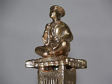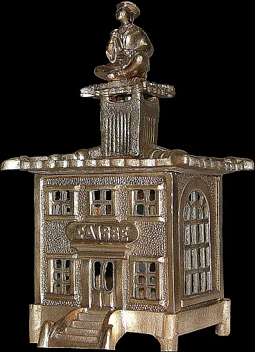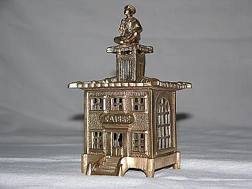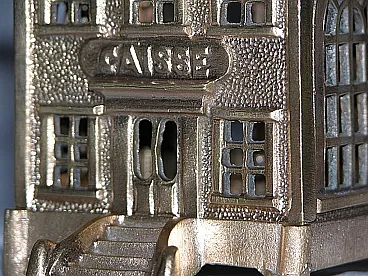 Realizzato in bronzo di alta qualità, il salvadanaio presenta una finitura che mette in risalto la lucentezza del materiale, conferendo un aspetto elegante e durevole. La patina naturale del bronzo non solo aggiunge carattere, ma rende il pezzo resistente e capace di mantenere la sua bellezza nel tempo.