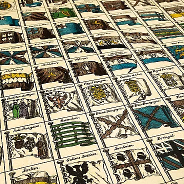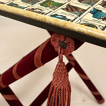 Made in Italy in the 1950s, this extraordinary tray table by Piero Fornasetti represents one of the highlights of his decorative production. Made entirely of silkscreened and painted iron, the work depicts a visual encyclopedia of power and history: a grid of coats of arms of the world's rulers, each meticulously illustrated with vivid colors and subtle nuances, arranged in a regular composition that conveys the idea of a universal catalogue. The heraldic theme, dear to Fornasetti for its dual symbolic and ornamental nature, is reinterpreted here with irony and graphic precision, blending the language of ancient engraving with the modernity of industrial printing. Each coat of arms tells a fragment of identity, a territory, a dynasty: together they construct a global, almost utopian vision, where the cartography of power transforms into total decorative art. The tray, supported by a lightweight folding wooden structure covered in red velvet and enriched with decorative tassels, combines functionality and theatricality, fully embodying the Fornasetti aesthetic that makes each object a poetic microcosm. The patina of the metal surface of time amplifies the charm of a piece that today stands out as a rare and precious testimony to Italian design in the ’50s, halfway between art, craftsmanship and visual culture. A collector's item par excellence, this tray epitomizes Piero Fornasetti's ability to create a universe of encyclopedic curiosities, intellectual irony, and timeless beauty — a celebration of knowledge translated into art form. The wooden base featured a woodworm that was appropriately microwaved in a specialized center with documentation and certification that is attached to the cabinet.