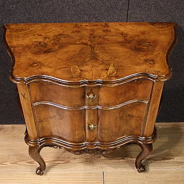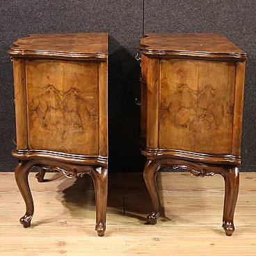 Pair of Venetian bedside tables from the mid-20th century. Furniture moved on the front and sides, carved and veneered in walnut and beech wood, with beautiful lines and pleasant furnishings. Bedside tables equipped with a drawer and a door, of good capacity.
