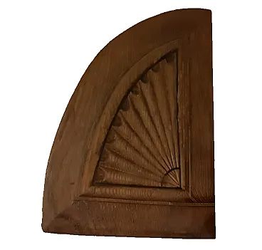 These wooden panels come from an ancient rural door, found decades ago in the Lombardy countryside. They were part of one of the two doors: the upper panel, with a refined semicircular fan carving, and the lower one, with the same motif and a suggestive metal door depicting a stylized human face: engraved hair, band on the head, ears from which the ring held by a hand starts. It recalls the protective figures carved on the thresholds of Mediterranean homes: a symbol of welcome and protection.