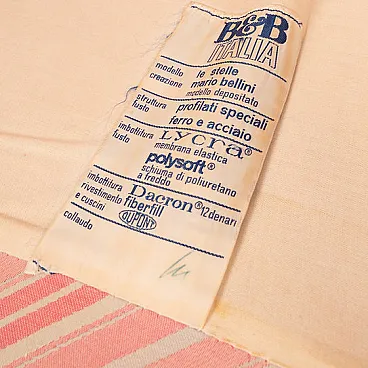 The original B&B Italia label, still present below the session, attests to its provenance and patented materials (Lycra®, Polysoft®, Dacron®), direct testimony to the company's technological philosophy.