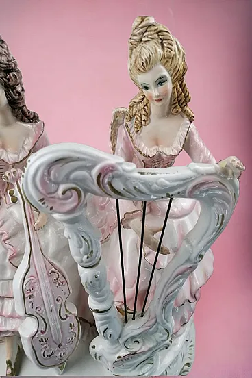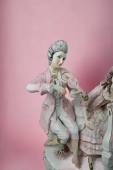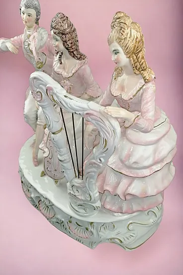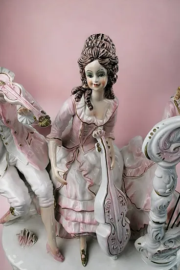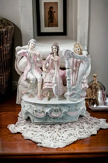 Realizzata in porcellana di alta qualità, la statua si distingue per la cura dei dettagli, dalle espressioni dei musici agli abiti pregiati che richiamano lo stile settecentesco. La porcellana, lucida e raffinata, rende giustizia all'eleganza della scena, permettendo di ammirare i colori vivaci e i sottili dettagli dei volti, degli strumenti e dei costumi.
