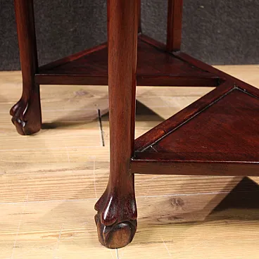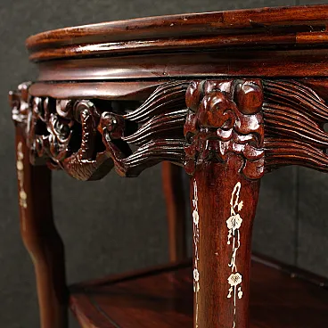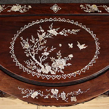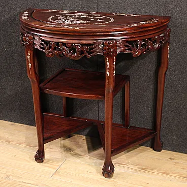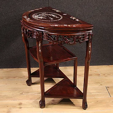 20th century Chinese console. Furniture carved and inlaid in exotic wood with excellent quality mother-of-pearl effect decoration. Crescent-shaped console equipped with two triangular shelves in the lower part of the cabinet, rectangular top in the middle and upper wooden top in character, finely inlaid with floral and animal decorations, of good size and service.