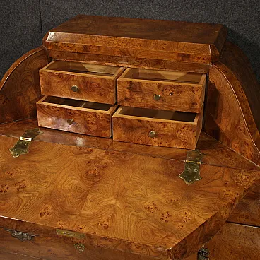 Lombard flap from the second half of the 20th century. Wavy and rounded furniture in Louis XV style veneered in elm and briar wood, with beautiful lines and proportions. Flap complete with three spacious external drawers. Interior of the drain equipped with four small drawers and a desk top of reasonable size and service. Urn furniture for living room or study, for antique dealers and interior designers, with pleasant furnishings. Flap complete with key and flap, with working lock. In good condition.
