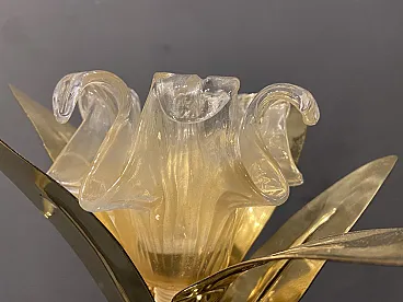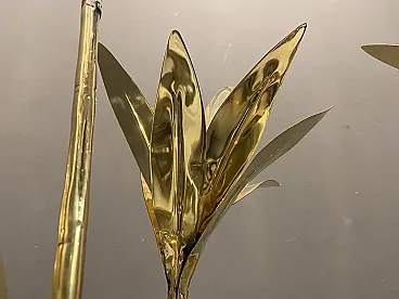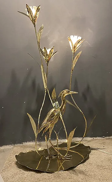 This large floor lamp from the 1970s with a brass base depicting a lurking heron and three light points is stamped and signed “Cittone Oggi Afreda”. It features gold-colored Murano glass lampshades in the shape of flowers. Equipped with 3 lights. Requires E14 bulbs. ┃