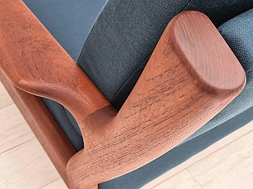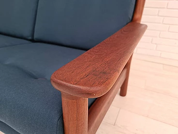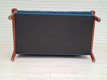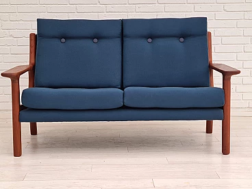 Completely renovated-reupholstered 2 pers. sofa. Scandinavian design. Made in about 1970-75. Armrest / legs of solid teak. Quality navy blue furniture wool fabric, art leather blue buttons. Brand new upholstery, brand new seat cushion. Reupholstered by craftsman. Wooden components has no defects, but it may show slight traces of use. This vintage item is in very good condition because it has been refreshed through new upholstery and refinishing.