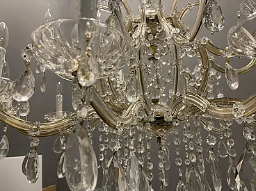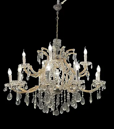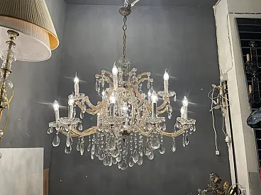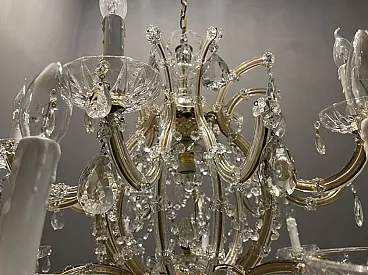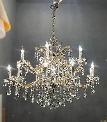 Large Italian crystal chandelier with 17 lights with central element in Murano glass. Requires 16 E14 bulbs and 1 E27 bulb. Fully restored, cleaned and rewired, all vintage crystals have been reattached by hand using the time-honored method designed to last a lifetime. New candle holders. Height including chain and rosette: 135 cm. Height without chain and rosette: 88 cm. Width: 106cm. Depth: 106 cm. New wiring installed compatible with UK, Europe and USA. ┃