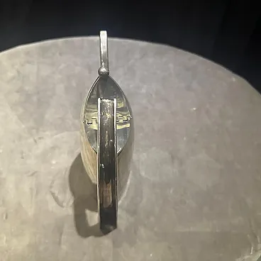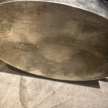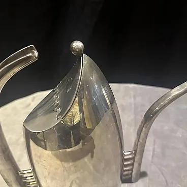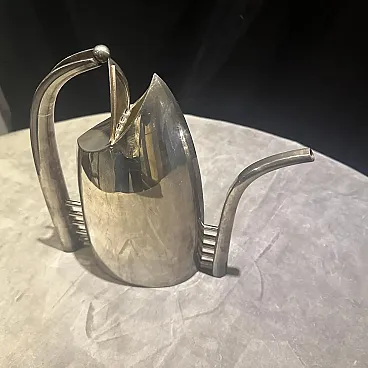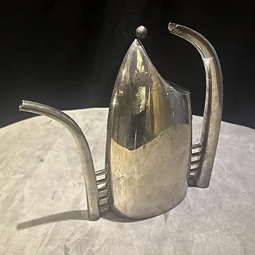 This is a striking and collectible 1989 Minimalist Silver Plated Coffee Pot, a renowned piece designed by the esteemed Italian silversmith Lino Sabattini. The pot is marked "FENICE 1989 COLLEZIONE SABATTINI ITALIA" and bears the engraved signature of Lino Sabattini, confirming its authenticity and provenance. Its sleek, sculptural, and aerodynamic form embodies the essence of Minimalist and Postmodern design. The highly reflective, silver-plated body has a distinctive, tapered shape, complemented by an elegantly curved spout and a gracefully arched handle. Both the handle and spout are affixed to the body by distinctive stepped, ladder-like supports, adding a characteristic architectural detail to the design. This piece is a functional object elevated to the level of art, representing Sabattini's mastery of metalwork and modern aesthetic. It is a perfect addition for collectors of 20th-century decorative arts or modernist Italian design. This silver-plated vessel is a true statement of Minimalist aesthetics, transforming a functional object into a striking, sculptural form. The design is characterized by its dramatic, streamlined silhouette, suggesting speed and elegance with its sharply pointed lid and organically curved body. Contrasting beautifully with the sleek body are the architectural, ribbed supports connecting the slender, arched handle and the gracefully curved spout, a signature Sabattini detail.. It is in good vintage condition, ready to be a showpiece in any collection of 20th-century decorative art or high-end modern design.
