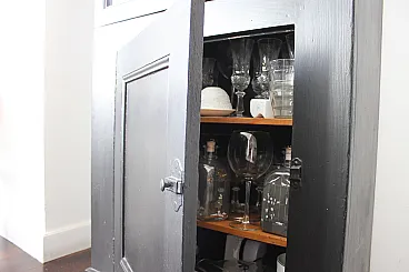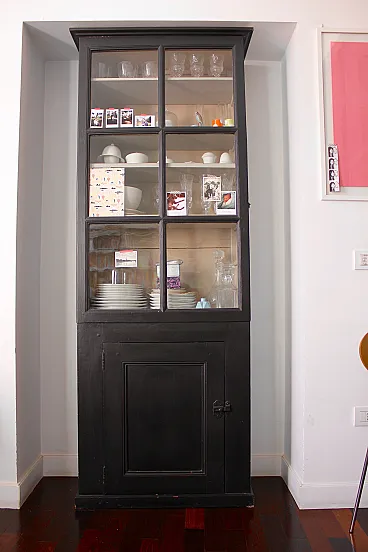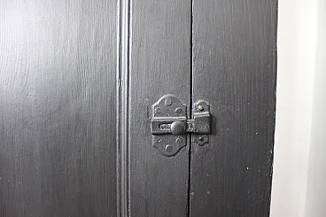 The display cabinet has been carefully restored: treated with woodworm remover and painted in matt black. However, I believe that it can be returned without difficulty to its original dusty gray color, still visible inside.