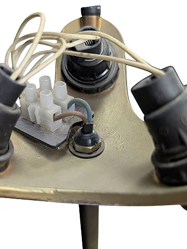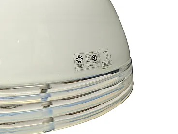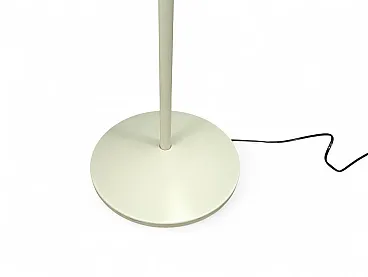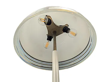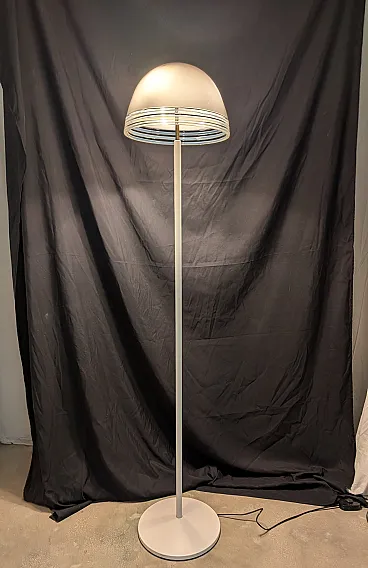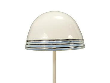 Elegant vintage floor lamp by Leucos, an authentic expression of Italian design and the Murano glassmaking tradition. The piece stands out for its refined hand-blown glass dome diffuser, characterized by an upper part in milk glass that fades into a base crafted with transparent crystal rings, creating an evocative play of light and transparencies. The minimal structure in white painted metal supports the lighting body, enhancing its formal purity, making this floor lamp a sophisticated and timeless furnishing accessory, certified by the original Vetri Murano label.