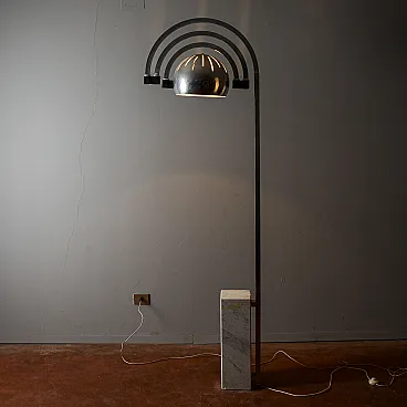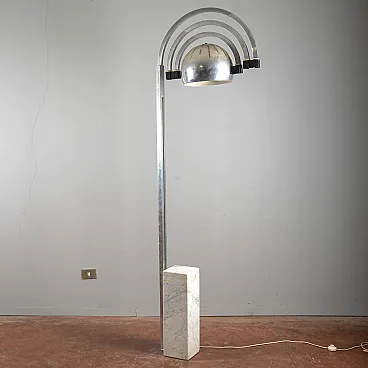 This spectacular arched floor lamp embodies the futuristic spirit of the Space Age style of the 1960s and 1970s, recalling the iconic design of major manufacturers such as Reggiani. Its bold design and sleek lines make it a visually striking piece of modernry, perfect for infusing a touch of vintage and sophisticated lighting into any space. The lamp features a floor-to-ceiling chrome-plated metal frame that curves into an elegant arch, balanced by a solid white marble base. The dome diffuser, also chrome, is enriched with decorative openings that create a unique play of light and shadow. The combination of marble and chrome is typical of this era, enhancing its sculptural nature. A collection opportunity for those who love the sought-after design.