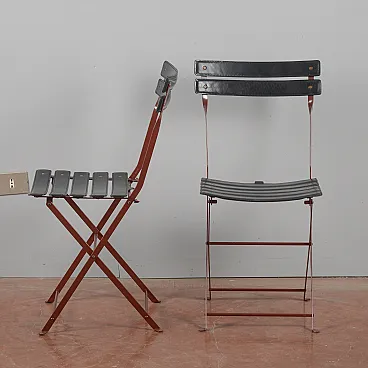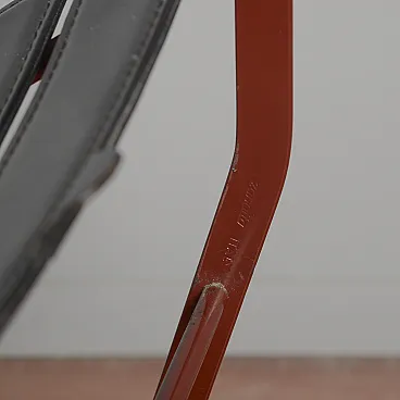 These Celestina folding chairs are a classic of modern Italian art, designed by Marco Zanuso for Zanotta in 1978. They represent an example of vintage design that combines essential aesthetics with maximum practicality, ennobling the concept of a folding chair. The painted steel structure, proposed here in a rust-red tone, contrasts elegantly with the seat and backrest composed of nylon slats covered in black leather. Marco Zanuso was able to combine the indestructibility of modern materials with the refinement of leather, making the Celestina suitable for different contexts, from internal to external spaces. Extremely compact from locks, they are ideal for those looking for flexible furniture solutions and a collector's item from a great master.