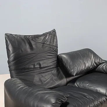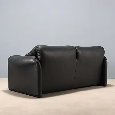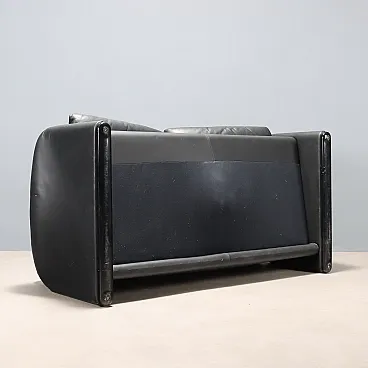 Two-seater sofa with foam padding and black leather upholstery, featuring a fold-down backrest and headrest. In good overall condition, with manufacturer\'s label.