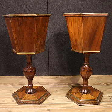 Pair of Italian coffee tables from the late 19th century. Furniture carved in walnut wood with golden brass decoration, with beautiful lines and pleasant furnishings. Bedside tables resting on a hexagonal base, supported by a central turned column and an upper body, also hexagonal, equipped with a door. Interior covered in paper with two support surfaces, of reasonable capacity.