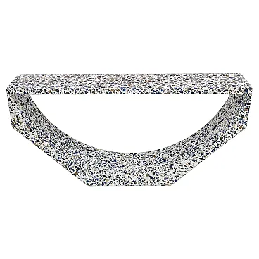 Crafted from composite terrace with stone fragments in shades of blue, white, and ochre, Arcata plays with light and texture, revealing ever-changing nuances depending on the observer's perspective. The linear plane blends seamlessly with the geometric base, transforming a functional surface into a sculptural statement.