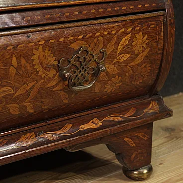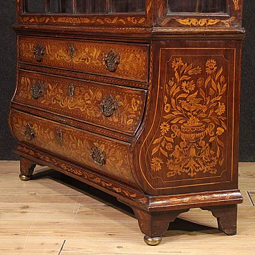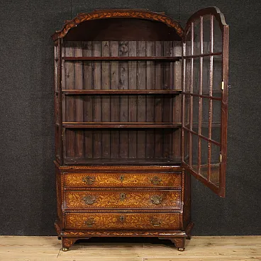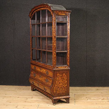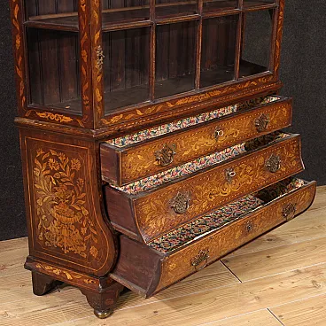 Dutch showcase from the second half of the 19th century. Furniture carved and inlaid with floral decorations, in oak, maple and fruit wood with beautiful lines and pleasant furnishings. Double body display cabinet equipped with three drawers with working keys and locks, of good capacity, in the lower part. Upper body with a single large door complete with two working locks and relative keys.