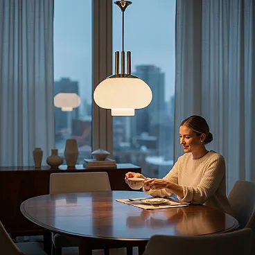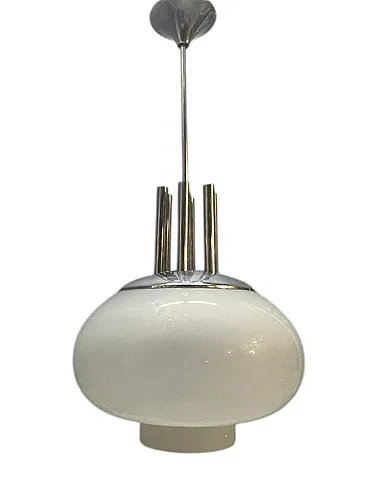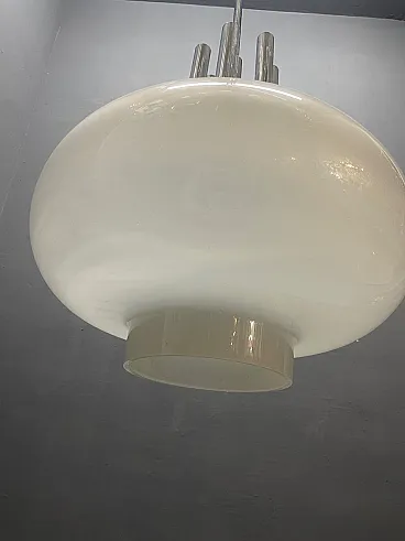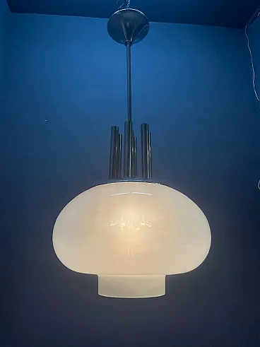 Mazzega Nason Large Chrome Murano Glass Pendant, 1970s A stunning example of space-age Italian design, this large Murano glass pendant attributed to Mazzega/Nason showcases the fine craftsmanship and bold aesthetic of 1970s lighting. The pendant features a beautifully rounded hand-blown Murano glass shade in an elegant opaline white, paired with a sculptural chrome frame that rises above the glass in six elegant tubular shapes. The combination of chrome and opal glass gives the piece a futuristic yet timeless quality, making it ideal for both modern and vintage interiors. The pendant houses six E14 lights, which create bright and uniform illumination. Freshly rewired and in full working order, it is suitable for use in EU, UK and USA environments. Details: - Origin: Italy - Manufacturer/Attribution: Mazzega / Nason - Period: 1970s - Style: Space Age / Mid-Century Modern - Materials: Murano glass, chrome - Height: 115 cm - Width: 50 cm - Number of lights: 6 - Bulb type: E14 - Condition: Excellent vintage condition; new wiring installed A rare and sculptural lighting piece, perfect for hallways, dining rooms, lofts or any space requiring bold Italian design.