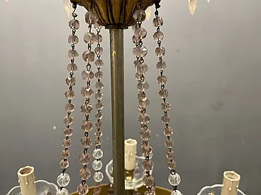 Italian Murano crystal chandelier from the 1950s. Bronze structure. Pink and clear crystals hang with lavender Murano glass drops on the crystal bobeches. 13 lights. Requires E14 screw bulbs. Height including chain and ceiling canopy: 98cm Width: 50cm Depth: 50cm Height without chain and ceiling canopy: 75cm Please message if you would like the chain lengthened or shortened. The height can be shortened or lengthened according to your needs. This chandelier has been restored; the missing crystals have been replaced with original crystals from the same period. The original cream silk lampshades are included.