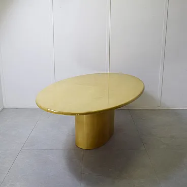 This artifact asserts itself with a powerful plastic charge, fully embodying Aldo Tura's investigation into the use of parchment. The material is here elevated to a valuable element, exhibiting a shifting nature capable of converting the presence of the furniture into a profound sensory experience. The structure, characterized by a generously sized top and impeccable formal balance, is supported by a cylindrical base. The surfaces, perceived as soft and velvety to the touch, intercept the light, diffusing it in warm and modulated hues, revealing the most reserved and precious essence of the raw material. The work concentrates the stylistic features that define Tura's artistic approach: the tactile sensuality of the parchment, the rigorous and proportioned architecture, the use of color as an emotional factor, and the constant oscillation between artisanal methods and experimentation. Tura, a unique and visionary personality in the context of Milanese design, was ahead of his time. Through his furniture upholstered with unconventional materials – parchment, eggshell, velvet, or leather – he anticipated the advent of a sophisticated decorativism and a refined eccentricity that would shape Italian taste in the '60s and '70s. This table, coming from a limited production entirely overseen by Tura's workshops, constitutes the perfect fusion of artisanal know-how and material research. These qualities make his creations particularly sought after in the international collecting scene today. The design, which combines solemnity and lyricism, conveys an idea of discreet and cultured luxury, finding the ultimate expression of its aesthetic authenticity in the natural imperfection of the parchment.
