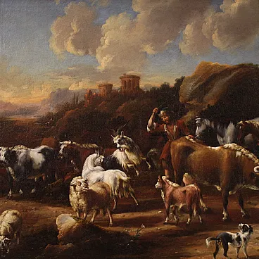 Work attributable to Johan Matiaz Wuerzer (1760-1838), a German master celebrated for his lively compositions with animals. (The painting is not currently accompanied by expertise but it is possible to request it upon payment of the relevant additional costs). Cattle, horses, goats and sheep are rendered with extraordinary naturalness and luminosity, within a classical landscape dominated by ancient ruins and soft light.
