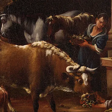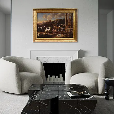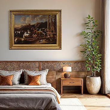 Large painting from the second half of the 18th century. Oil on canvas depicting a splendid Arcadian-style Italian landscape, a pastoral scene set in the Roman countryside. The painting presents typical characteristics of a genre that had great international success, and which experienced renewed splendor during Romanticism. Naturalistic precision is thus combined with a sentimental taste for rural life, a view that transcends simple realism to evoke an ideal world.