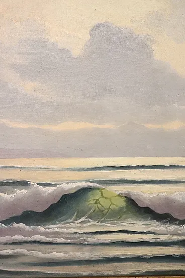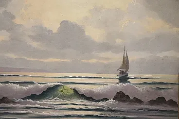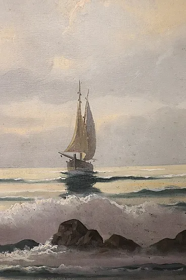 A wild beach where the sea gently laps the rocks, breaking its impetuous waves. Light plays a fundamental role, probably at dawn, delicately filtering through the clouds, creating an atmosphere of extreme serenity. On the right, a sailing ship adds a distinctive touch to the scene. If you love the sea and its fantastic shades of color, you absolutely must add this splendid painting to your collection.
