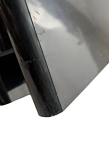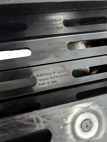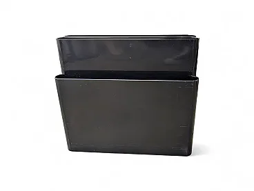 This is a magazine rack with an iconic design, produced by Kartell, characterized by a glossy black plastic structure with a minimal finish and rounded corners. The object features wavy vertical compartments designed to organize magazines and documents, and shows some signs of aging, such as superficial scratches and small signs of wear, typical of a vintage piece. The details engraved on the internal side unequivocally identify it as Model 4676 designed by Giotto Stoppino, a famous classic of Made in Italy industrial design. dimensions 35 x 40 x 19 cm (H x W x D) SKU 421264