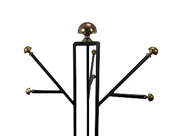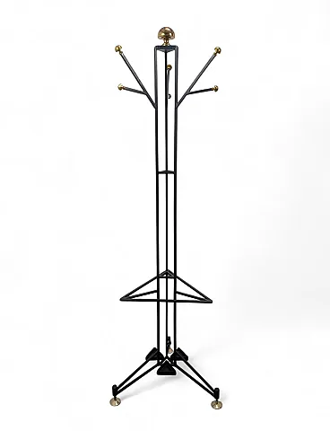 A floor coat hanger that embodies the elegance of mid-century design, characterized by a slender black iron structure that rises with a rigorous and minimalist geometry.