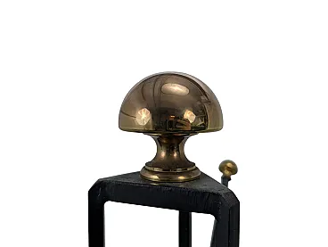 The adjustable brass feet add a functional and refined touch, enhancing the material contrast between the dark solidity of the iron and the warm and sophisticated glow of the brass.