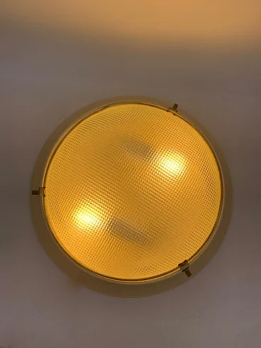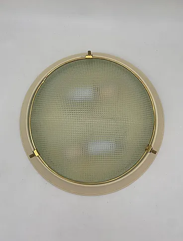 At the center is a circular diffuser made of hand-worked glass on a mold with a cross-mesh texture, which serves to diffuse light homogeneously while reducing glare. The glass is enclosed by a thin brass ring, fixed to the base by 3 small brackets of the same material, arranged equidistantly along the perimeter. The ensemble creates an elegant and discreet effect, suitable for illuminating rooms such as corridors, entrances or bedrooms with a touch of vintage taste.