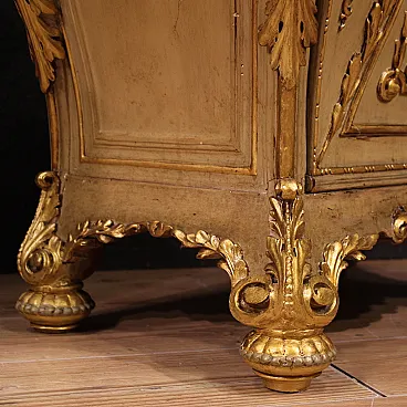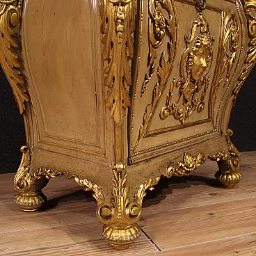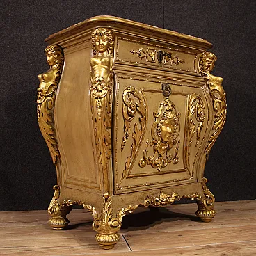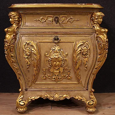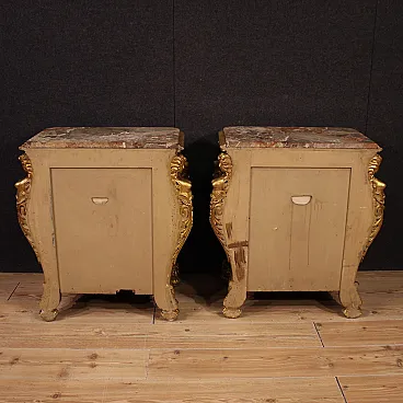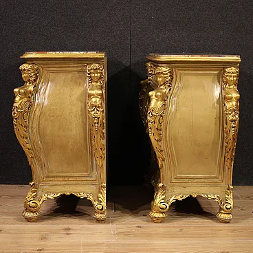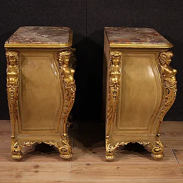 Pair of Italian bedside tables from the first half of the 20th century. Excellent quality furniture in carved, lacquered and gilded wood, adorned with lateral caryatids and a front mask. Original built-in marble tops that have undergone restoration, now intact and in fair condition (with some signs of the restoration).