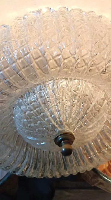 This is a vintage glass ceiling light, probably made in Murano by Barovier & Toso, dating back to the 1950s or 1960s. This type of lamp, often made of blown or hand-cut glass, is highly sought after in the antiques and modern art markets. The lampshade is made of clear, textured glass with a ribbed or "granilla" pattern that diffuses light in a unique way. Its elegant classic-modern design is typical of mid-20th-century Italian furniture. Similar models have been attributed to renowned designers and glassmakers such as Barovier & Toso, Venini and Seguso. It features a central gold brass knob for mounting. It can be installed on the ceiling (ceiling light) or on the wall (applique).