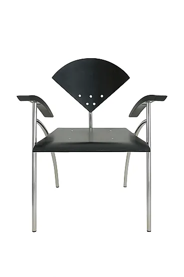 A postmodern armchair from the 1990s, created in the expressive aesthetic characteristic of Stol Kamnik’s production in Slovenia. The piece reflects strong Memphis-influenced geometry with its fan-shaped backrest and sculptural silhouette.