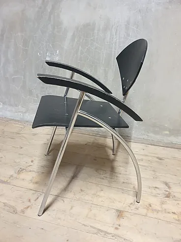 The structure combines chromed metal framing with bent plywood elements finished in black. The surface shows light patina and small marks consistent with age, while the overall construction remains solid and stable.