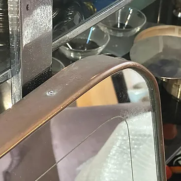 Presenta un'impressionante e semplice silhouette rettangolare con angoli superiori graziosamente arrotondati, un elemento di design caratteristico dell'epoca. Il vetro dello specchio è incorniciato da una sottile ed elegante cornice in ottone che ha sviluppato una bella patina vintage autentica, coerente con la sua età.