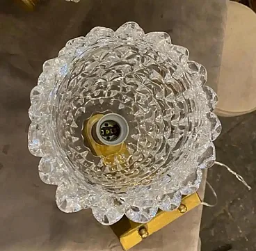 A pair of wall lights designed and manufactured in Italy in the style of Barovier, which invented this particular glass processing technique named Rostrato characterized by large light-reflecting points. These points are obtained through a particular technical expedient, with brass retaining its original patina and fully restored electrical parts. They work with both 110 and 220 Volts and require regular E27 bulbs. These Wall Sconces are stunning and unique lighting fixtures that epitomize the elegance and sophistication of their era. Combining the sleek lines and minimalist design of Mid-Century Modern aesthetics with the artistic craftsmanship associated with the Barovier style, these wall sconces can serve as a statement piece in a living room, hallway, or dining area, adding both functional illumination and a touch of timeless elegance to the space. Their unique combination of artistic glasswork and iconic Mid-Century Modern design makes them a sought-after choice for those who appreciate the beauty of vintage Italian lighting. They come form a shop going out of business in South Italy, and they are in excellent condition.