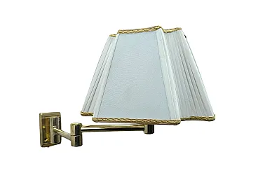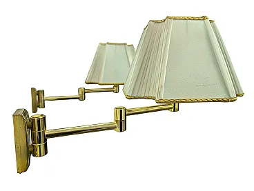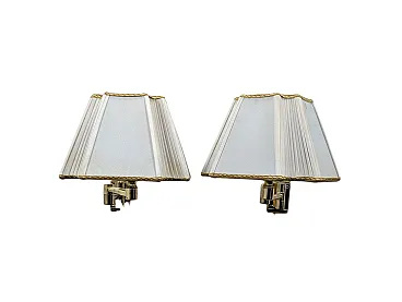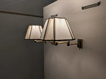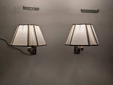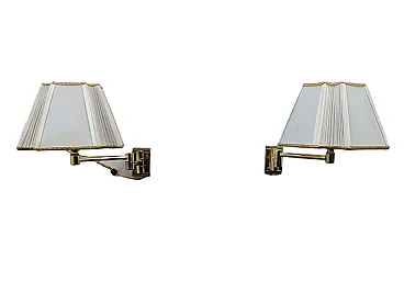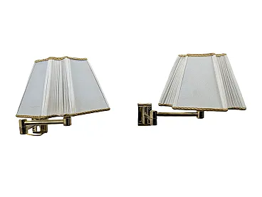They are equipped with a double-jointed adjustable arm that allows you to move the light point closer or further away from the wall. The lampshades have a truncated pyramid or trapezoidal shape, made of light-coloured fabric and have a vertical fold structure (plissé) on some panels, framed by a golden cord edge which underlines the upper and lower line, giving an elegant and refined touch.
