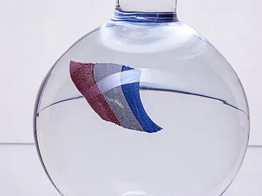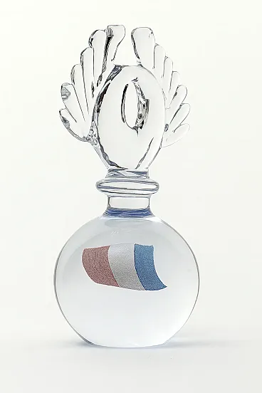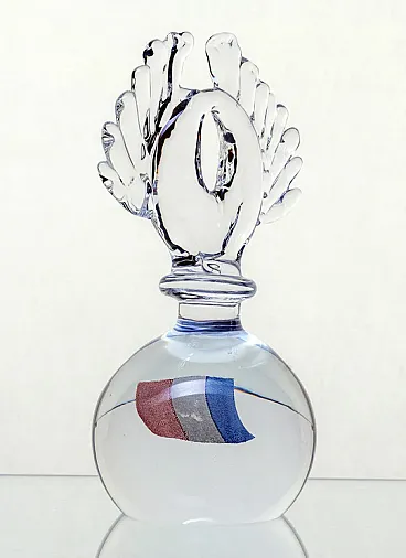 The piece is made entirely of clear glass, shaped into a rounded base with a decorative sculpted top. Inside the glass sphere is a sealed fabric element featuring the French flag, adding a unique visual contrast. The object is preserved in excellent vintage condition, with no cracks or chips visible.