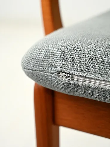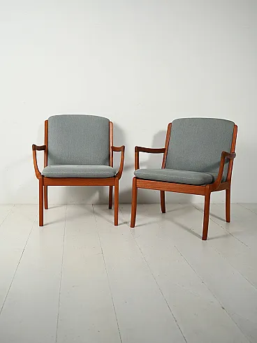 Refined pair of Senator model armchairs designed by Ole Wanscher for Cado in the 1960s. Crafted from solid teak, they feature soft lines and an elegantly finished structure, exemplifying the mastery of mid-century Danish design. The classical inspiration, linked to Latin-Roman culture, gives balance and harmony to the proportions. Removable grey-blue fabric covering.