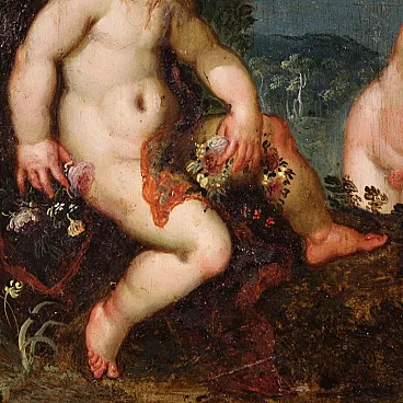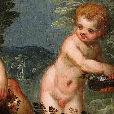 Refined 17th century Flemish painting. Oil on copper work depicting a splendid mythological scene, a wonderful landscape with Venus and a cupid. The young Goddess is sitting at the foot of a tree, weaving and receiving flowers from a smiling putto. The composition is immersed in a wooded landscape that opens onto a horizon full of meticulous naturalistic details. The reference to the taste for Flemish roundness is evident, the rendering of the complexion is soft with pink veils, the modeling is soft and the chiaroscuro is soft.