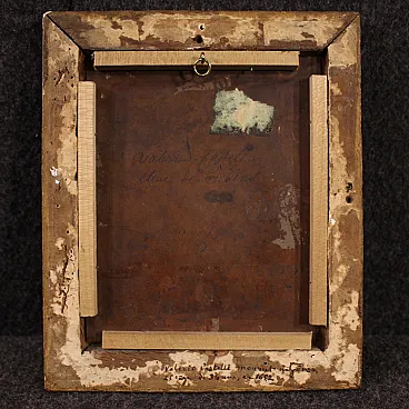 The work, small in size but of great lyrical intensity, stands out for the grace of the figures and the preciousness of the floral rendering. A fascinating painting, easily placed in any environment, ideal for a collector of Nordic paintings. A small Flemish jewel on a rare and precious support, perfect for enriching a wunderkammer, the so-called chamber of wonders. Non-coeval frame in gilded wood from the 19th century, with some signs of aging. Work with small retouches, overall in excellent state of conservation. Painting light H 16 x W 12 cm